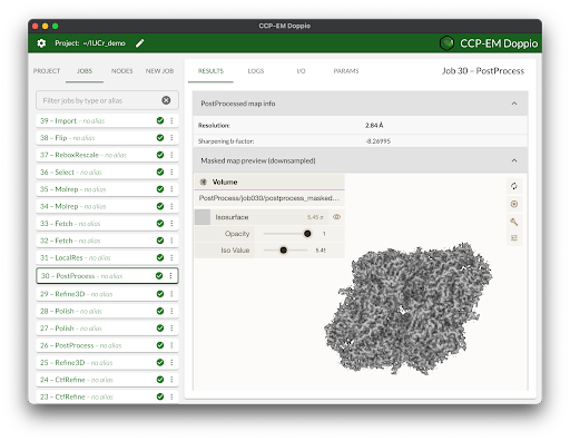 The CCP-EM software suite provides access to a wide range of software for cryoEM, integrated into a common framework. Note that some are distributed by CCP-EM and others need to be obtained separately. A complete list and help with installation can be found in the user guide. Within Doppio, the JOB INFO button provides a summary of each task and underlying software. Supported software includes: