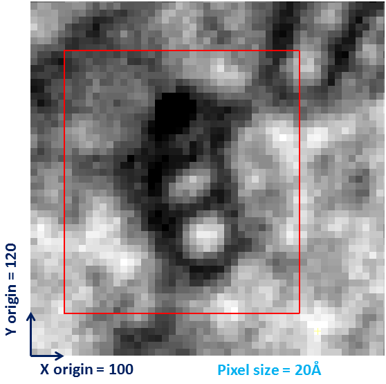 For other modes, ORIGIN specifies the real space location of a subvolume taken from a larger volume. In the (2-dimensional) example shown above, the header of the map containing the subvolume (red rectangle) would contain ORIGIN = 100, 120 to specify its position with respect to the original volume (assuming the original volume has its own ORIGIN set to 0, 0).